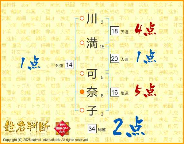 川(3画)満(15画) 可(5画)奈(8画)子(3画)