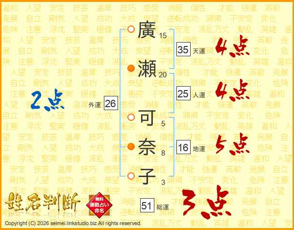 廣(15画)瀬(20画) 可(5画)奈(8画)子(3画)