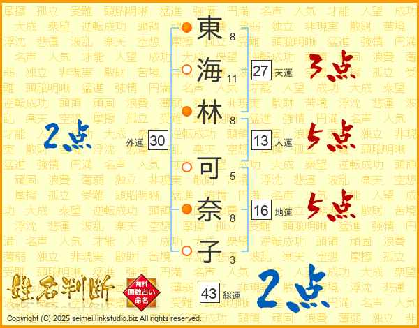 東(8画)海(11画)林(8画) 可(5画)奈(8画)子(3画)