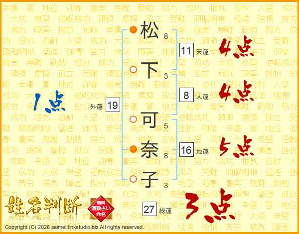 松(8画)下(3画) 可(5画)奈(8画)子(3画)