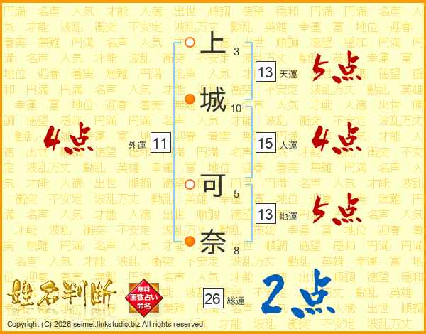 生活面を象徴する運勢です。外部から受ける影響力を表し、結婚運、家庭運や職場、環境への順応性を表します。総運から人運を引いた画数。姓や名が1文字の場合を除く。