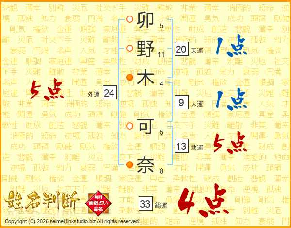 卯野木可奈さんの総運は33画の4点!