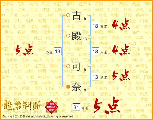 あなたの人生を表す1番重要な運勢です。生涯を通じて影響する総合運となり、主に50歳以降の晩年期に影響を及ぼします。苗字と名前の合計画数。