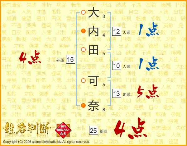 大(3画)内(4画)田(5画) 可(5画)奈(8画)
