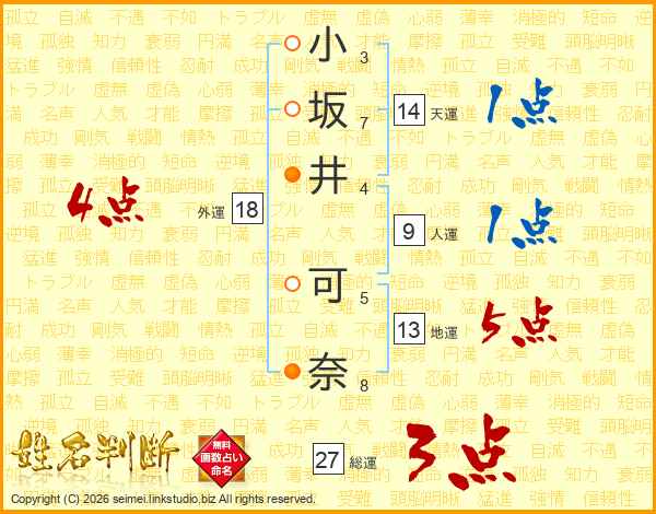 小(3画)坂(7画)井(4画) 可(5画)奈(8画)