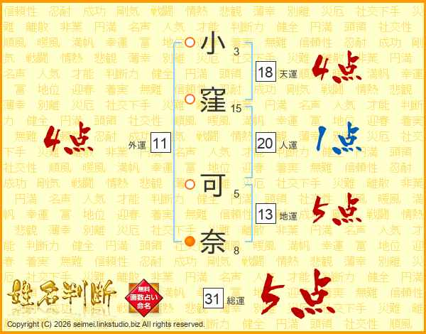生活面を象徴する運勢です。外部から受ける影響力を表し、結婚運、家庭運や職場、環境への順応性を表します。総運から人運を引いた画数。姓や名が1文字の場合を除く。