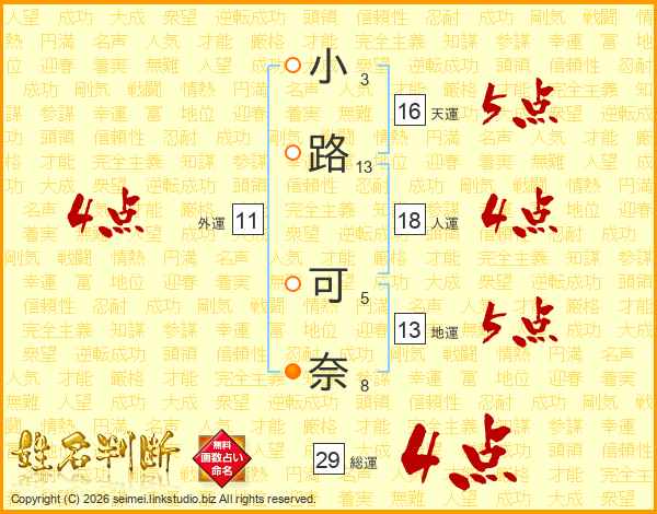 生活面を象徴する運勢です。外部から受ける影響力を表し、結婚運、家庭運や職場、環境への順応性を表します。総運から人運を引いた画数。姓や名が1文字の場合を除く。