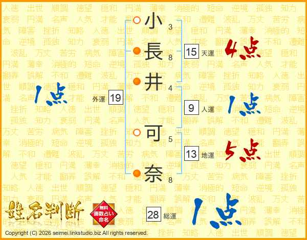 小(3画)長(8画)井(4画) 可(5画)奈(8画)