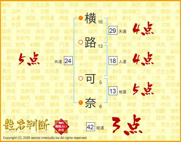 横(16画)路(13画) 可(5画)奈(8画)