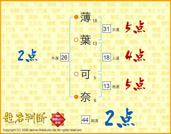 薄(18画)葉(13画) 可(5画)奈(8画)