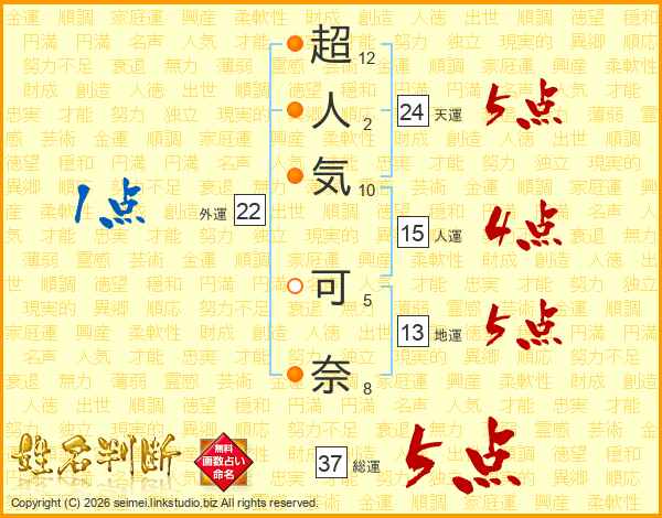 超(12画)人(2画)気(10画) 可(5画)奈(8画)