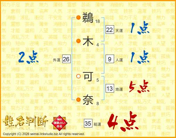 鵜(18画)木(4画) 可(5画)奈(8画)