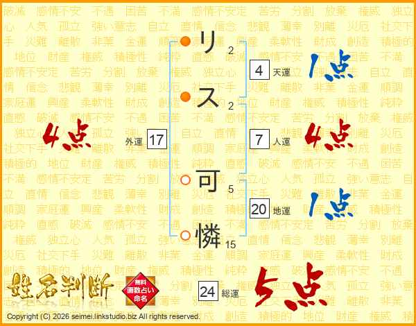 リ(2画)ス(2画) 可(5画)憐(15画)