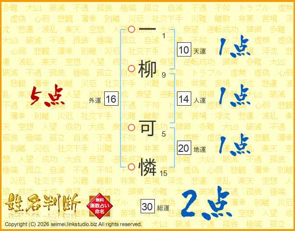 生活面を象徴する運勢です。外部から受ける影響力を表し、結婚運、家庭運や職場、環境への順応性を表します。総運から人運を引いた画数。姓や名が1文字の場合を除く。