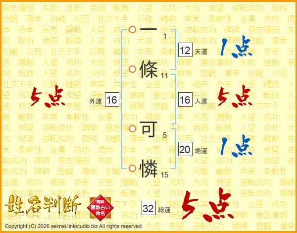 生活面を象徴する運勢です。外部から受ける影響力を表し、結婚運、家庭運や職場、環境への順応性を表します。総運から人運を引いた画数。姓や名が1文字の場合を除く。