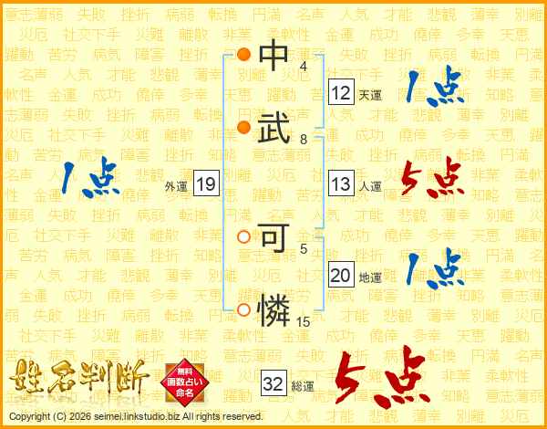 中(4画)武(8画) 可(5画)憐(15画)