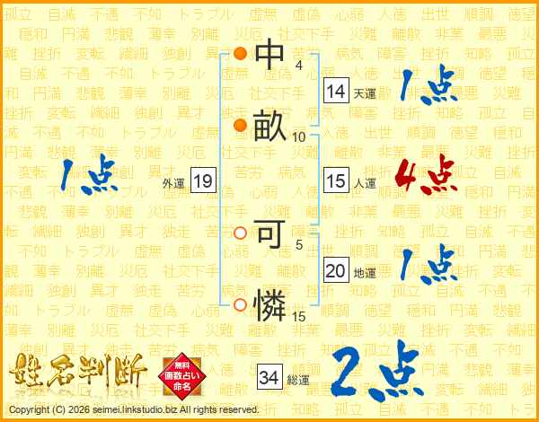 生活面を象徴する運勢です。外部から受ける影響力を表し、結婚運、家庭運や職場、環境への順応性を表します。総運から人運を引いた画数。姓や名が1文字の場合を除く。