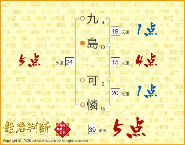 生活面を象徴する運勢です。外部から受ける影響力を表し、結婚運、家庭運や職場、環境への順応性を表します。総運から人運を引いた画数。姓や名が1文字の場合を除く。