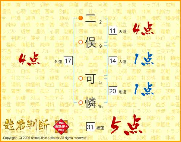 生活面を象徴する運勢です。外部から受ける影響力を表し、結婚運、家庭運や職場、環境への順応性を表します。総運から人運を引いた画数。姓や名が1文字の場合を除く。
