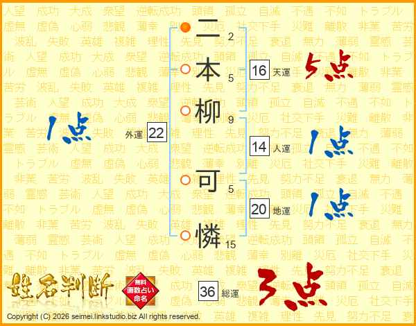 二本柳可憐さんの総運は36画の3点!