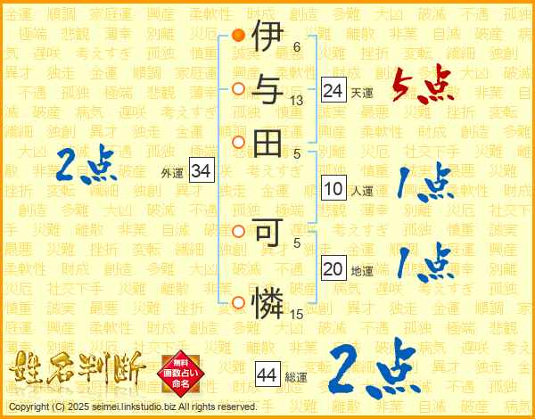 伊(6画)与(13画)田(5画) 可(5画)憐(15画)