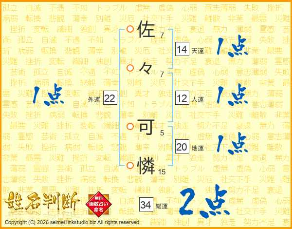 佐(7画)々(7画) 可(5画)憐(15画)