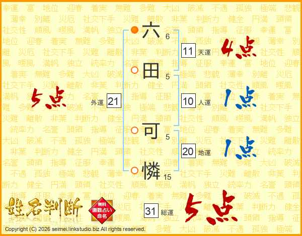 生活面を象徴する運勢です。外部から受ける影響力を表し、結婚運、家庭運や職場、環境への順応性を表します。総運から人運を引いた画数。姓や名が1文字の場合を除く。