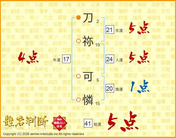 生活面を象徴する運勢です。外部から受ける影響力を表し、結婚運、家庭運や職場、環境への順応性を表します。総運から人運を引いた画数。姓や名が1文字の場合を除く。
