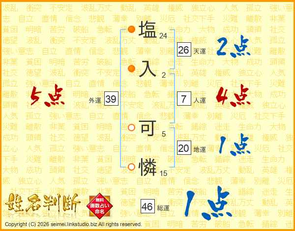 生活面を象徴する運勢です。外部から受ける影響力を表し、結婚運、家庭運や職場、環境への順応性を表します。総運から人運を引いた画数。姓や名が1文字の場合を除く。