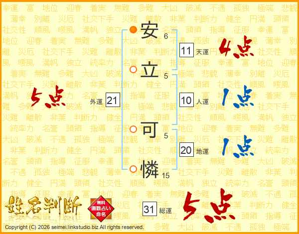 生活面を象徴する運勢です。外部から受ける影響力を表し、結婚運、家庭運や職場、環境への順応性を表します。総運から人運を引いた画数。姓や名が1文字の場合を除く。