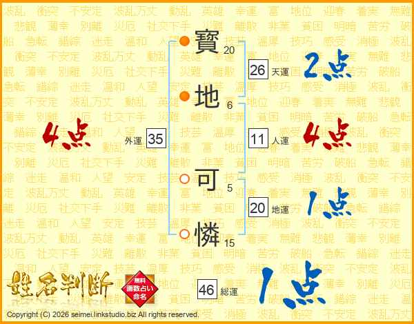 生活面を象徴する運勢です。外部から受ける影響力を表し、結婚運、家庭運や職場、環境への順応性を表します。総運から人運を引いた画数。姓や名が1文字の場合を除く。