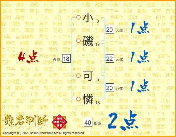 生活面を象徴する運勢です。外部から受ける影響力を表し、結婚運、家庭運や職場、環境への順応性を表します。総運から人運を引いた画数。姓や名が1文字の場合を除く。