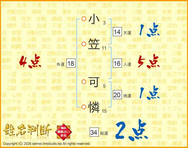 生活面を象徴する運勢です。外部から受ける影響力を表し、結婚運、家庭運や職場、環境への順応性を表します。総運から人運を引いた画数。姓や名が1文字の場合を除く。