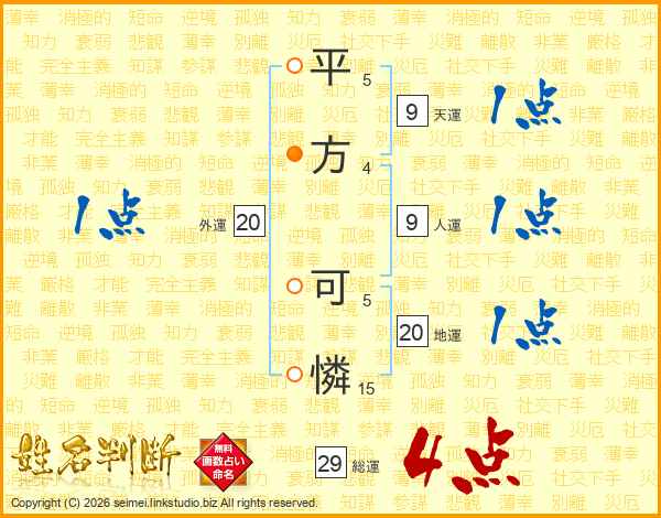 平方可憐さんの総運は29画の4点!