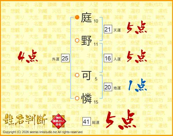 生活面を象徴する運勢です。外部から受ける影響力を表し、結婚運、家庭運や職場、環境への順応性を表します。総運から人運を引いた画数。姓や名が1文字の場合を除く。