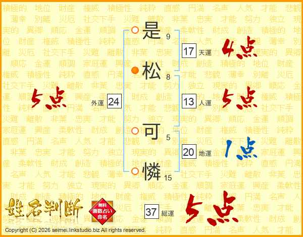 生活面を象徴する運勢です。外部から受ける影響力を表し、結婚運、家庭運や職場、環境への順応性を表します。総運から人運を引いた画数。姓や名が1文字の場合を除く。