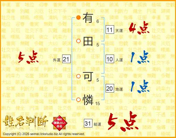 生活面を象徴する運勢です。外部から受ける影響力を表し、結婚運、家庭運や職場、環境への順応性を表します。総運から人運を引いた画数。姓や名が1文字の場合を除く。