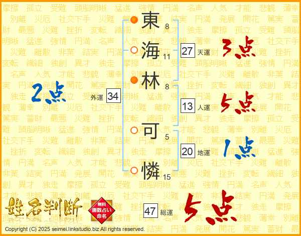 東(8画)海(11画)林(8画) 可(5画)憐(15画)