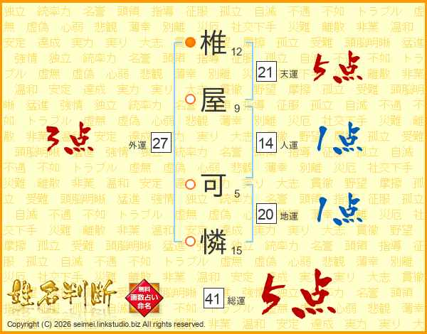 椎屋可憐さんの総運は41画の5点!