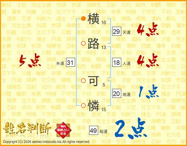 生活面を象徴する運勢です。外部から受ける影響力を表し、結婚運、家庭運や職場、環境への順応性を表します。総運から人運を引いた画数。姓や名が1文字の場合を除く。