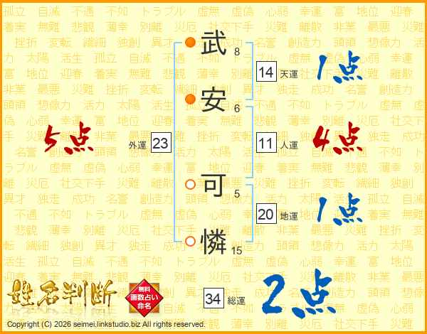 生活面を象徴する運勢です。外部から受ける影響力を表し、結婚運、家庭運や職場、環境への順応性を表します。総運から人運を引いた画数。姓や名が1文字の場合を除く。