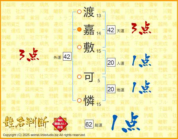 渡(13画)嘉(14画)敷(15画) 可(5画)憐(15画)