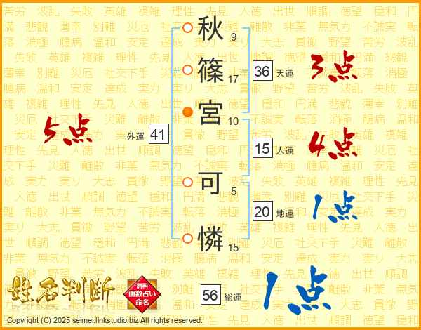 秋(9画)篠(17画)宮(10画) 可(5画)憐(15画)