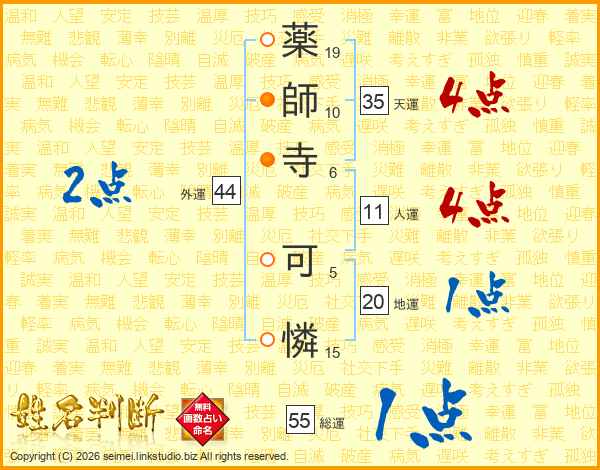 薬(19画)師(10画)寺(6画) 可(5画)憐(15画)