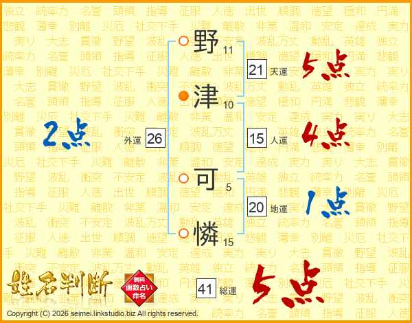 生活面を象徴する運勢です。外部から受ける影響力を表し、結婚運、家庭運や職場、環境への順応性を表します。総運から人運を引いた画数。姓や名が1文字の場合を除く。
