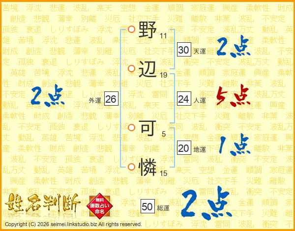 生活面を象徴する運勢です。外部から受ける影響力を表し、結婚運、家庭運や職場、環境への順応性を表します。総運から人運を引いた画数。姓や名が1文字の場合を除く。