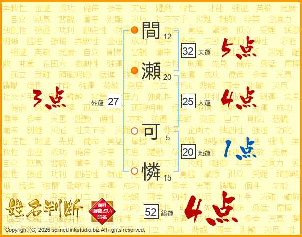 間瀬可憐さんの総運は52画の4点!