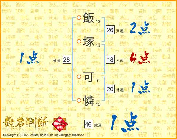 飯(13画)塚(13画) 可(5画)憐(15画)
