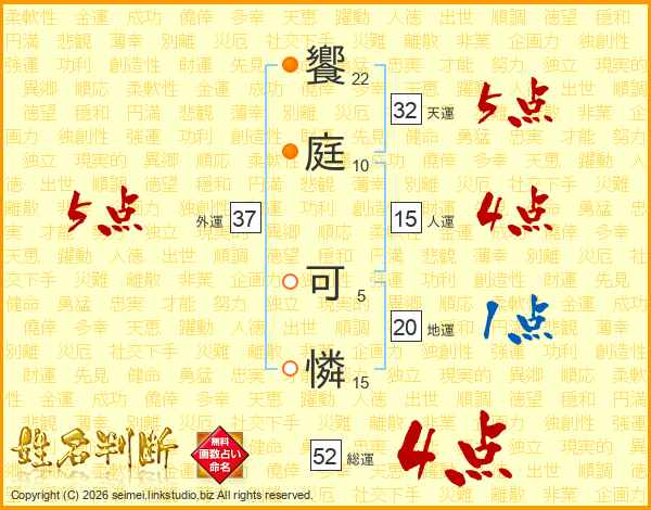 生活面を象徴する運勢です。外部から受ける影響力を表し、結婚運、家庭運や職場、環境への順応性を表します。総運から人運を引いた画数。姓や名が1文字の場合を除く。