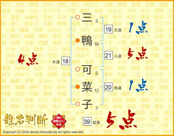 三鴨可菜子さんの総運は39画の5点!